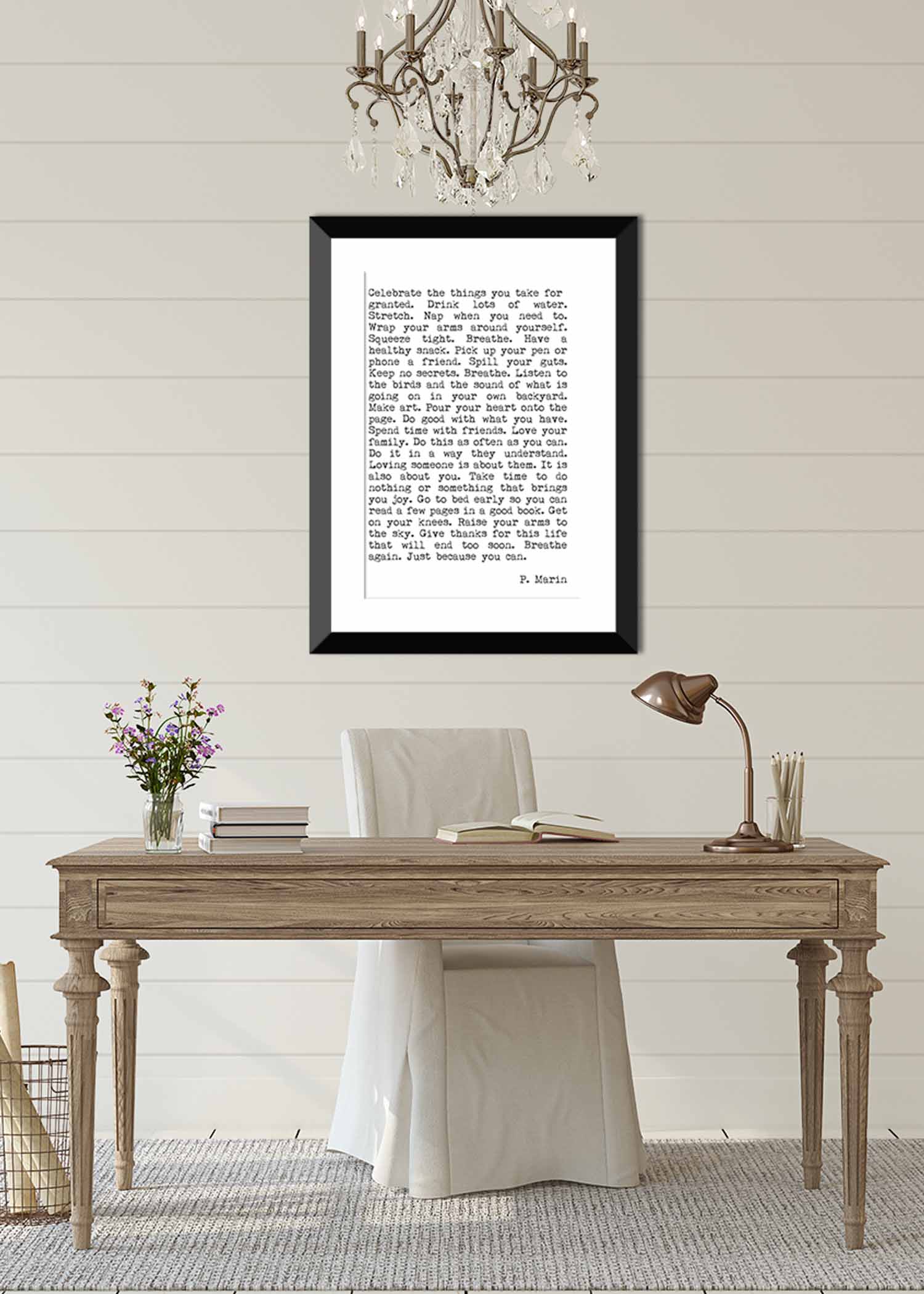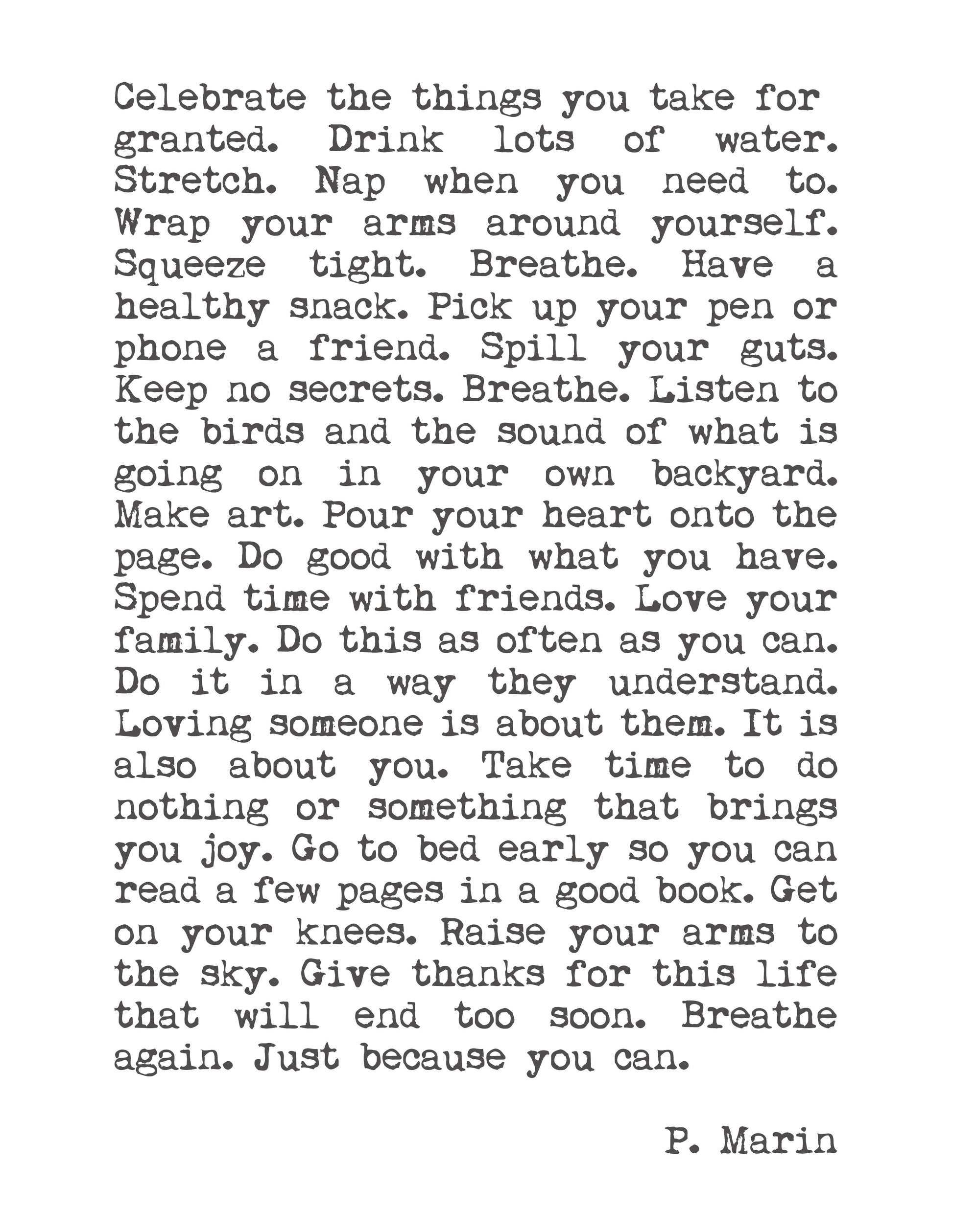 "Celebrate the things you take for granted. Drink lots of water. Stretch. Nap when you need to. Wrap your arms around yourself. Squeeze tight. Breathe. Have a healthy snack. Pick up your pen or phone a friend. Spill your guts. Keep no secrets. Breathe. Listen to the birds and the sound of what is going on in your own backyard. Make art. Pour your heart onto the page. Do good with what you have. Spend time with friends. Love your family. Do this as often as you can. Do it in a way they understand. Loving someone is about them. It is also about you. Take time to do nothing or something that brings you joy. Go to bed early so you can read a few pages in a good book. Get on your knees. Raise your arms to the sky. Give thanks for this life that will end too soon. Breathe again. Just because you can."